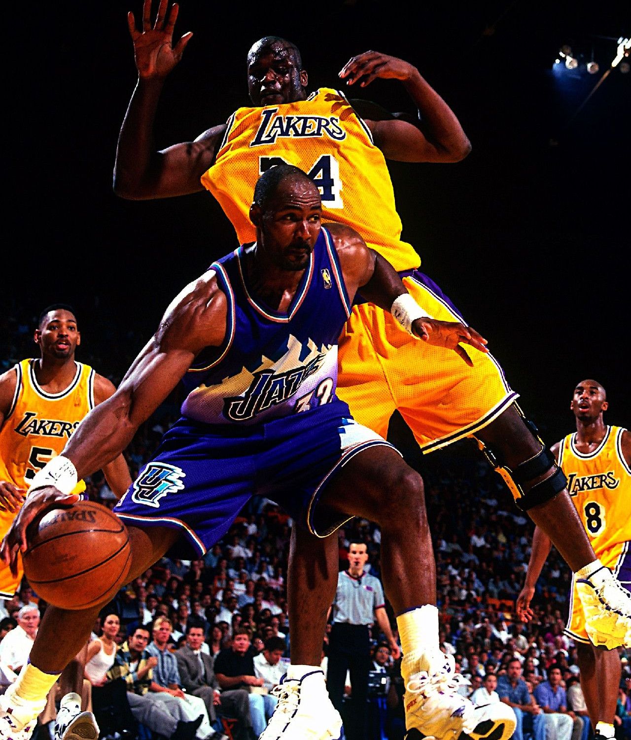 #12- KARL MALONE – “The Mailman” running the outside lane, and rattling the rim in his early days was a scary sight.